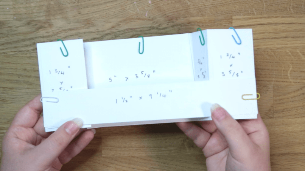 - Cut the decorative panels following the measurements above. Adhere these to the appropriate panels on the front of your card base.
